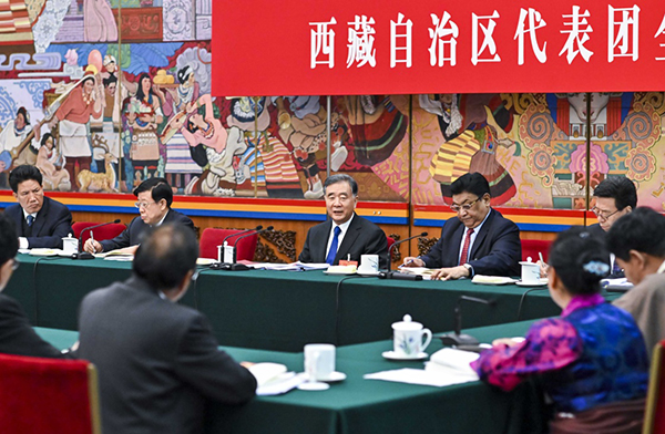 汪洋在西藏代表团参加审议。在听取普布顿珠、格桑卓嘎、扎西江村等代表发言后,汪洋表示,完全赞成栗战书委员长所作的全国人大常委会工作报告。汪洋充分肯定过去一年西藏各项事业发展成绩,指出西藏经济发展和社会稳定持续向好,但也要看到风险挑战。要深入学习贯彻习近平总书记关于西藏工作的重要论述,牢牢把握维护祖国统一、加强民族团结的着眼点和着力点,牢牢把握依法治藏、富民兴藏、长期建藏、凝聚人心、夯实基础的重要原则,居安思危、稳中求进,进一步巩固社会大局稳定好局面,进一步加强寺庙管理能力建设,进一步提高脱贫攻坚质量,确保雪域高原安定祥和、各族人民安居乐业。