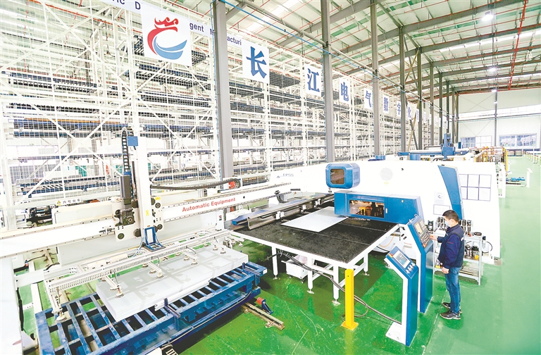 2022年3月23日,湖北武汉东湖高新区长江电气数字化智造中心,工业机器人的机械臂抓起一块块镀铝板飞快进行折弯、打孔、裁剪等工序。图为长江电气数字化智造中心柔性生产线。中新社记者 张畅 摄