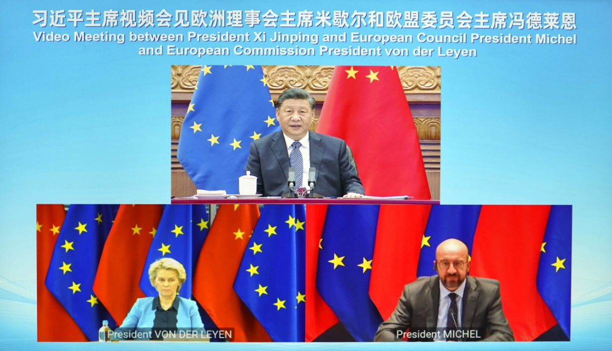 国家主席习近平4月1日晚在北京以视频方式会见欧洲理事会主席米歇尔和欧盟委员会主席冯德莱恩。