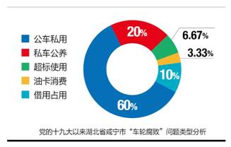 清单一:公车私用趋隐蔽。以咸宁为例,党的十九大以来公车私用占“车轮腐败”问题60%以上,且呈现出隐蔽化新特点。一是变通私用。如有的单位对干部开绿灯,将公务用车当作接送上下班的通勤车使用。二是租车私用。有的用公款租赁车辆逃避监督。三是公私混用。如打着办公事名义办私事,企图蒙混过关。四是擅驾私用。有的单位对公务用车长期疏于管理,致使公车长期被驾驶员私开私用。
