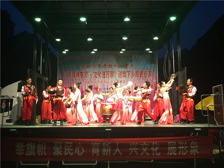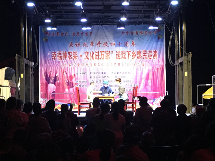 8月27日晚,松柏镇堂房村内一片热闹,为庆祝改革开放40周年,多部门联合举办的“幸福神农架·文化进万家”系列活动,将富有神农架地方色彩的方言剧、小品、皮影戏等带到群众身边。