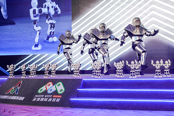 2020年10月15日下午,深圳一年一度的创客盛会——2020全国双创周深圳活动暨第六届深圳国际创客周在龙岗区星河WORLD拉开帷幕。图为开场秀人机互动表演。(图片来源:人民视觉)