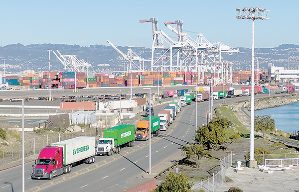 连日来,产品需求量大导致美国南加州沿岸两个最大港口的集装箱积压。(图片来源:视觉中国)