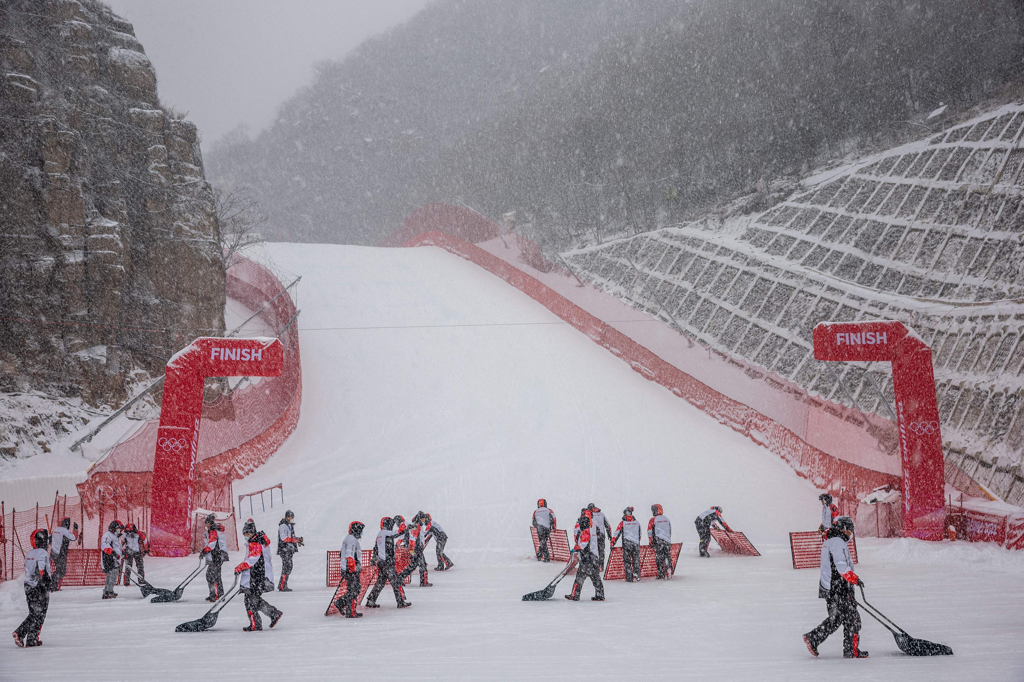 2月13日,北京迎来降雪天气,延庆赛区国家高山滑雪中心工作人员有序开展清雪工作保障赛事进行。 (图片来源:视觉中国)
