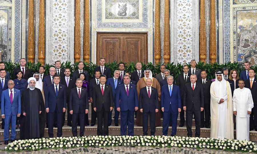 6月15日,亚洲相互协作与信任措施会议第五次峰会在塔吉克斯坦首都杜尚别举行。国家主席习近平出席峰会并发表重要讲话。这是出席会议的亚信成员国领导人或代表,观察员国代表以及有关国际和地区组织代表集体合影。新华社记者 张领 摄