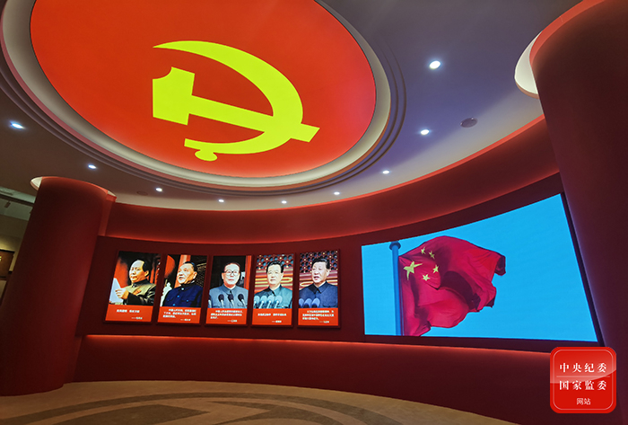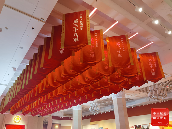 图为展厅上方飘扬的中国人民志愿军各部队军旗。(中央纪委国家监委网站 聂新鑫 摄)