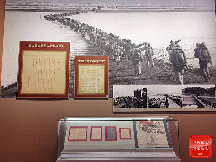 图为展览上展示的中国人民志愿军入朝参战誓词和中国人民志愿军战歌。(中央纪委国家监委网站 聂新鑫 摄)