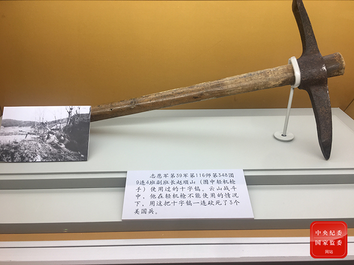 图为志愿军第39军第116师第348团9连4班副班长赵顺山使用过的十字镐。(中央纪委国家监委网站 段相宇 摄)