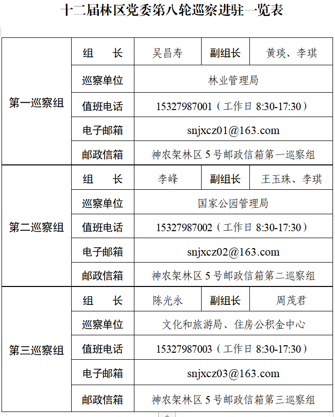 根据《中国共产党巡视工作条例》、中共湖北省委《关于市县党委建立巡察制度的实施意见》和中共神农架林区委员会《关于建立巡察制度的实施意见》等规定,经林区党委同意,林区党委巡察组将于2020年10月26日至11月27日对林业管理局、神农架国家公园管理局、文化和旅游局、住房公积金中心开展常规巡察。